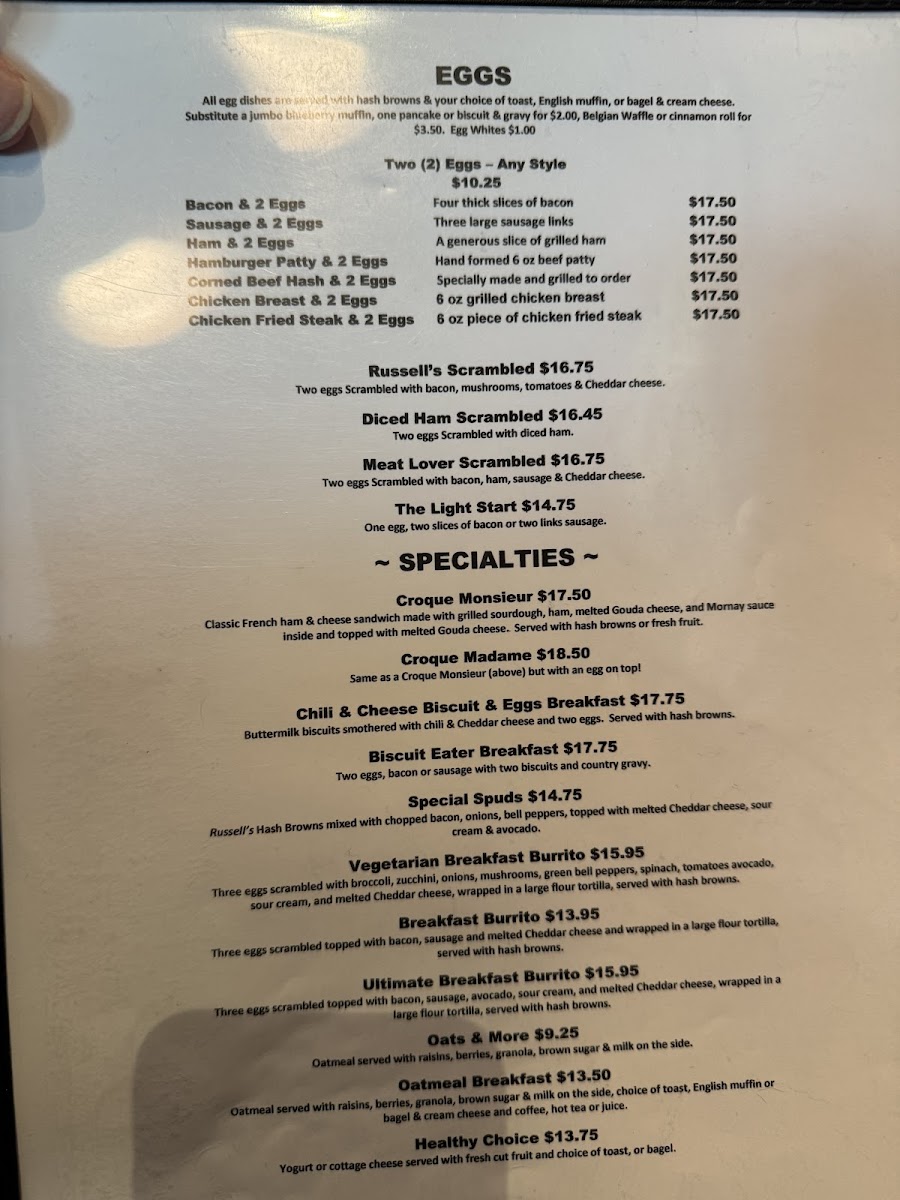 Russell’s offers a thoughtfully simple menu centered around classic American breakfast and lunch favorites, perfectly suited for a relaxed morning or midday pause. The menu balances comforting, familiar dishes with fresh, carefully prepared options that feel right at home in its cozy diner setting.
